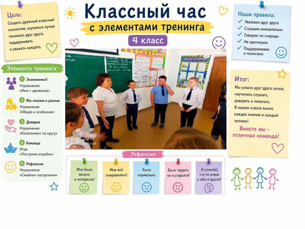 Төртінші сынып оқушыларына бесінші сыныпқа көшпес бұрын мазасыздықты азайтуға және өзіне деген сенімділік пен оң көзқарасты дамытуға көмектесу. Іс-шараны білім беру психологы Л.В. Аменова жүргізді, ол оқушыларға орта мектепке көшуге дайындалуға, ықтимал қиындықтарды талқылауға және бесінші сыныпта сенімді оқуға дайындалуға көмектесті.